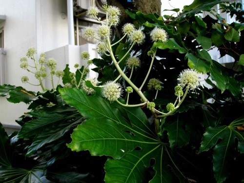 ヤツデ Fastia japonica (ウコギ科 ヤツデ属) ヤツデは秋から冬の花の少ない季節の日だまりの中で、次々と長期間にわたって花を咲かせる。天気が良いとハエなどの昆虫がたくさん来訪している。花序は2回分裂してその先端に多数の花が球状に付く。ヤツデ Fastia japonica (ウコギ科 ヤツデ属) ヤツデは秋から冬の花の少ない季節の日だまりの中で、次々と長期間にわたって花を咲かせる。天気が良いとハエなどの昆虫がたくさん来訪している。花序は2回分裂してその先端に多数の花が球状に付く。ヤツデに花が咲きました。 このヤツデ、植えたわけではなく いつのまにか 勝手に?生えていたものが どんどん成長していって 先月、開花したのですが・・・ 花はきれいなんですよ。 でも・・なんか・・・においが・・・ そして・・・ 黒いものが